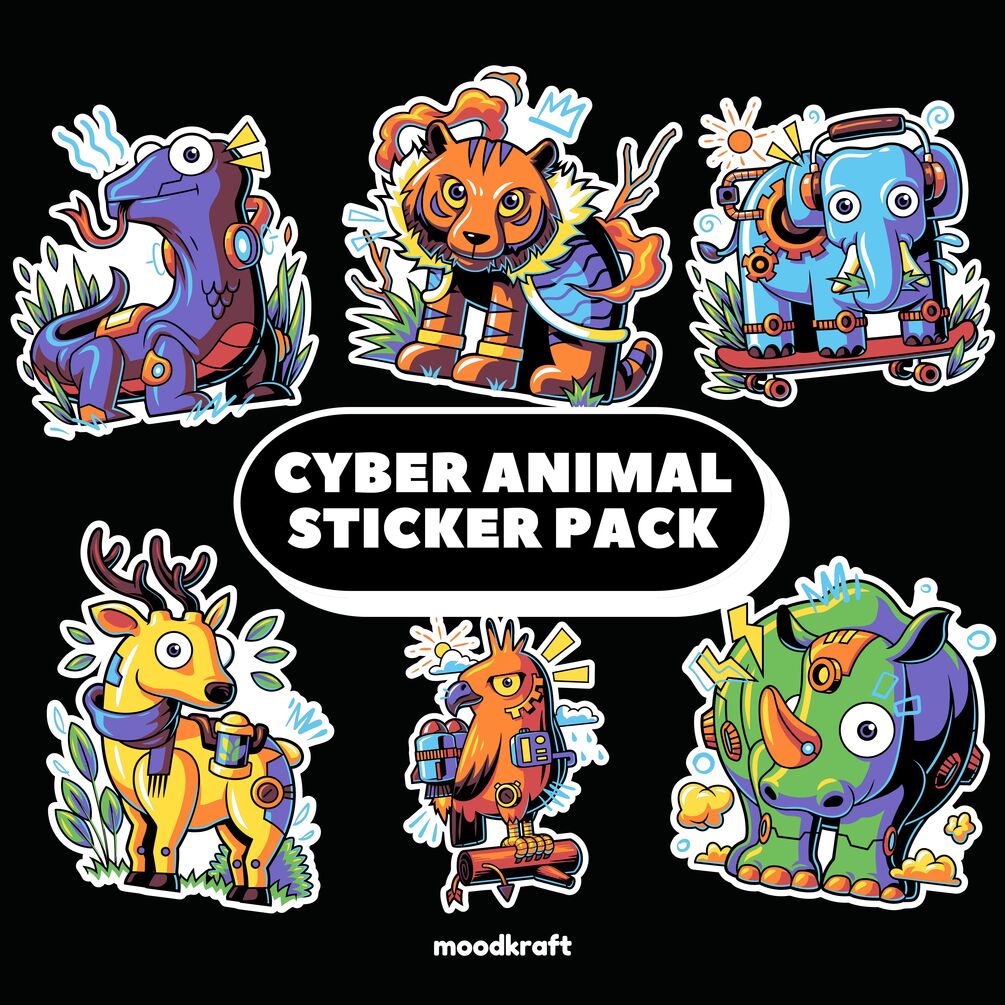 CYBER ANIMAL STICKER PACK in PNG (transparent background) and SVG (editable vector files) ready to use in all your projects with personal or commercial license.